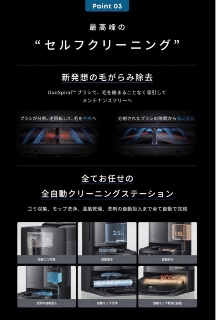 - 全自動クリーニングステーション:ゴミ収集・モップ洗浄・乾燥